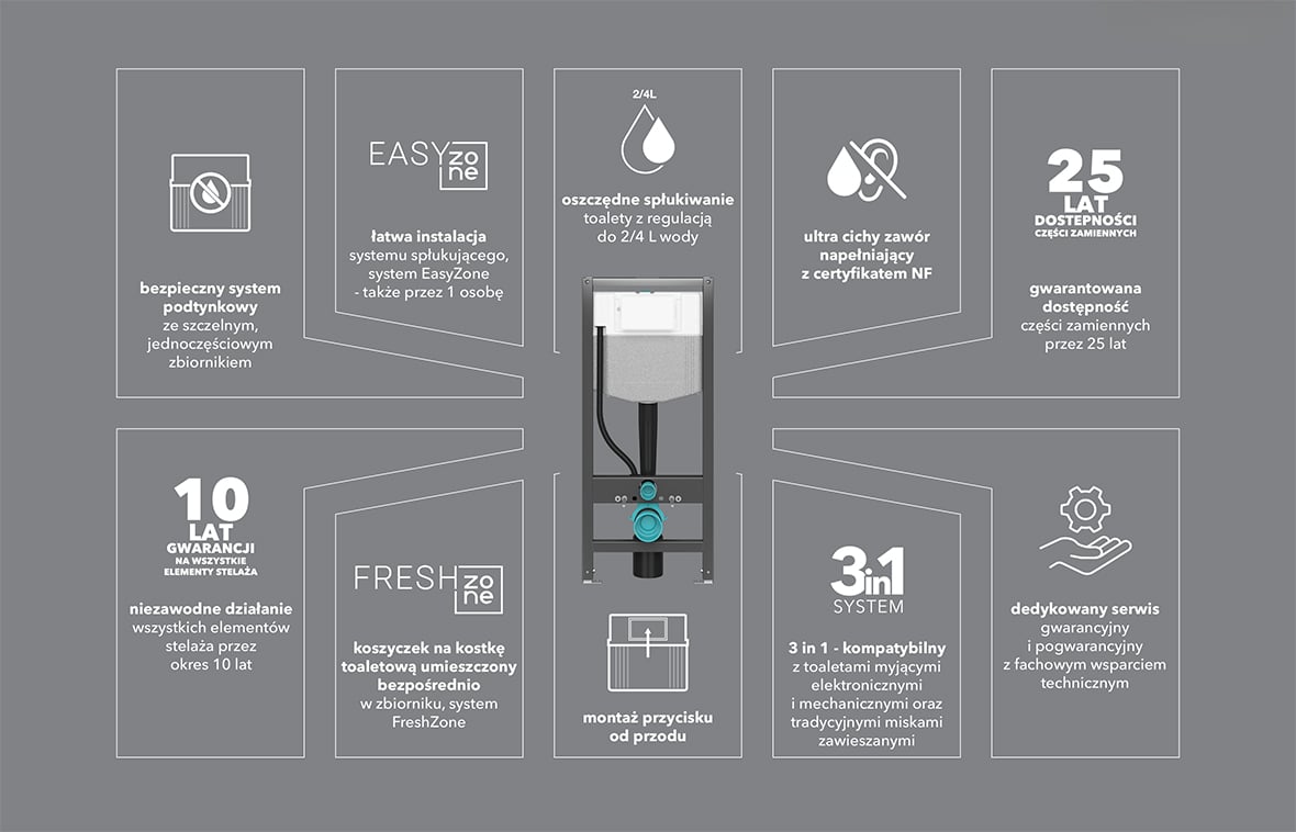 Stelaż pozwala na oszczędzanie wody dzięki dwudzielnemu systemowi spłukiwania z ustawieniami 2/4L, 3/5L lub 3/6L. Dodatkowo, ultra cichy zawór napełniający z certyfikatem NF oraz system FreshZone w zestawie zapewniają komfort i higienę w łazience. Możliwość podłączenia wody do zbiornika w dwóch punktach (góra lub tył centralnie) oraz serwisowalny zawór kątowy zwiększają funkcjonalność.