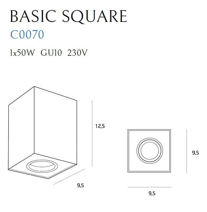 Moc/Power: 1 x 50W GU10 230V W: 9,5 , D: 9,5 cm, H: 12,5 cm , Wykończenie/Detail finishing: białe/white mat Materiał/Material: metal/metal Nie zawiera żarówek/bulbs excluded