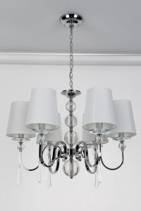 Moc/Power: 6 x 40W E14 230V H: max 130 cm, Ø: 70 cm, abażur/shade Ø : 12-16 cm, H: 18 cm, Wykończenie/Detail finishing:chrom/chrome Materiał/Material: metal, szkło, tkanina/metal, glass, fabric Nie zawiera żarówek/bulbs excluded