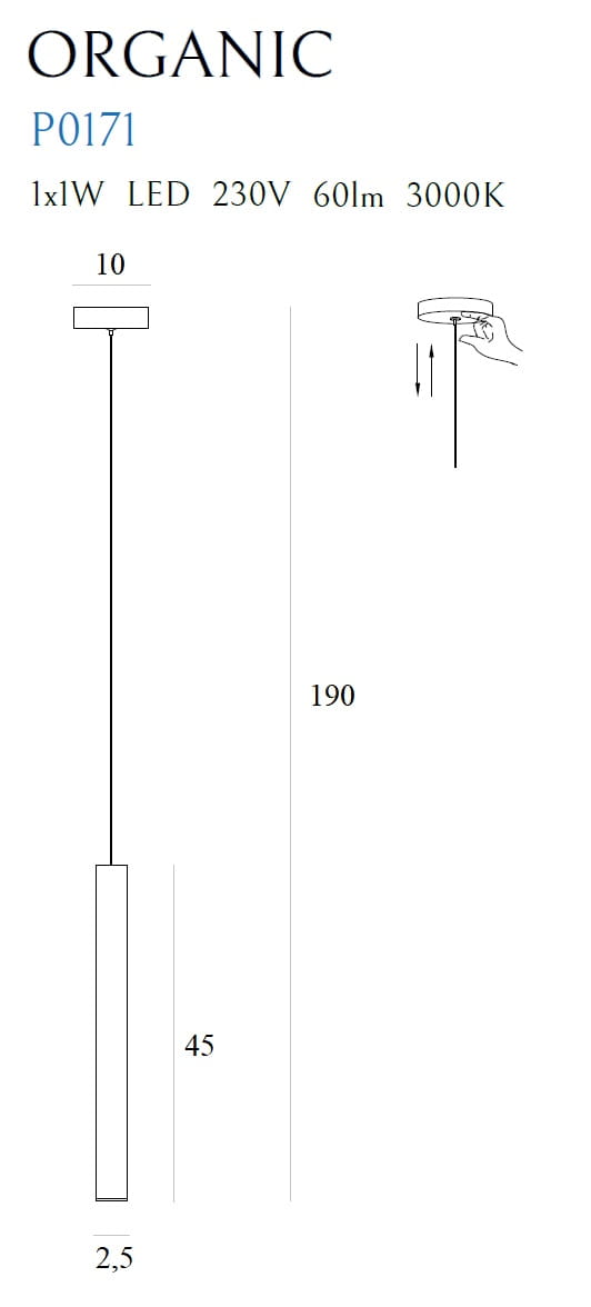 Moc/Power: 1 x 1W LED 230V, 60 LM, CRI90 3000K H: max 190 cm, Ø: 2,5 cm Wykończenie/Detail finishing: miedź/copper Materiał/Material: stal nierdzewna, akryl/ stainless steel , acrylic LED w komplecie/LED included 3000K