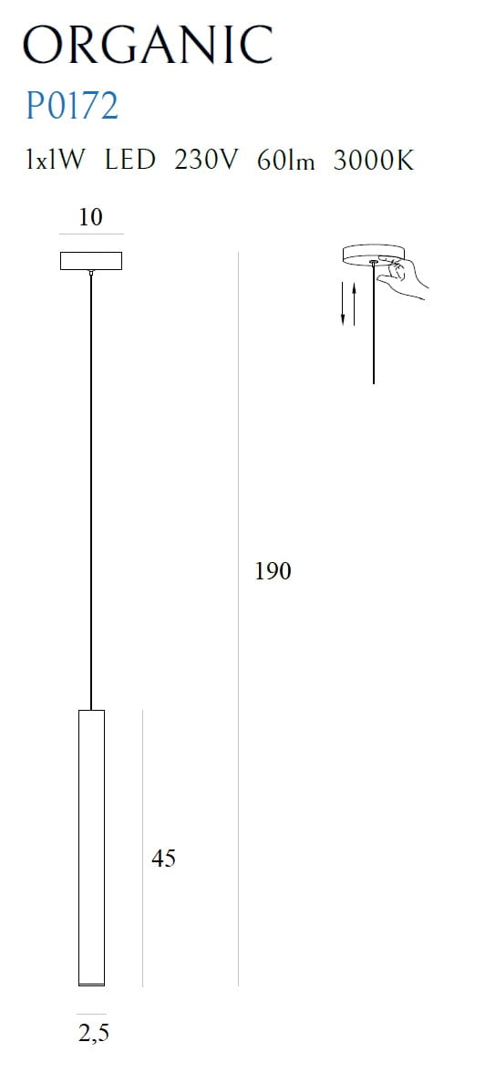 Moc/Power: 1 x 1W LED 230V, 60 LM, CRI90 3000K H: max 190 cm, Ø: 2,5 cm Wykończenie/Detail finishing: chrom/chrome Materiał/Material: stal nierdzewna, akryl/ stainless steel , acrylic LED w komplecie/LED included 3000K