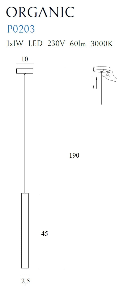 Moc/Power: 1 x 1W LED 230V, 60 LM, CRI90 3000K H: max 190 cm, Ø: 2,5 cm Wykończenie/Detail finishing: czarne/black Materiał/Material: stal nierdzewna, akryl/ stainless steel, acrylic LED w komplecie/LED included 3000K