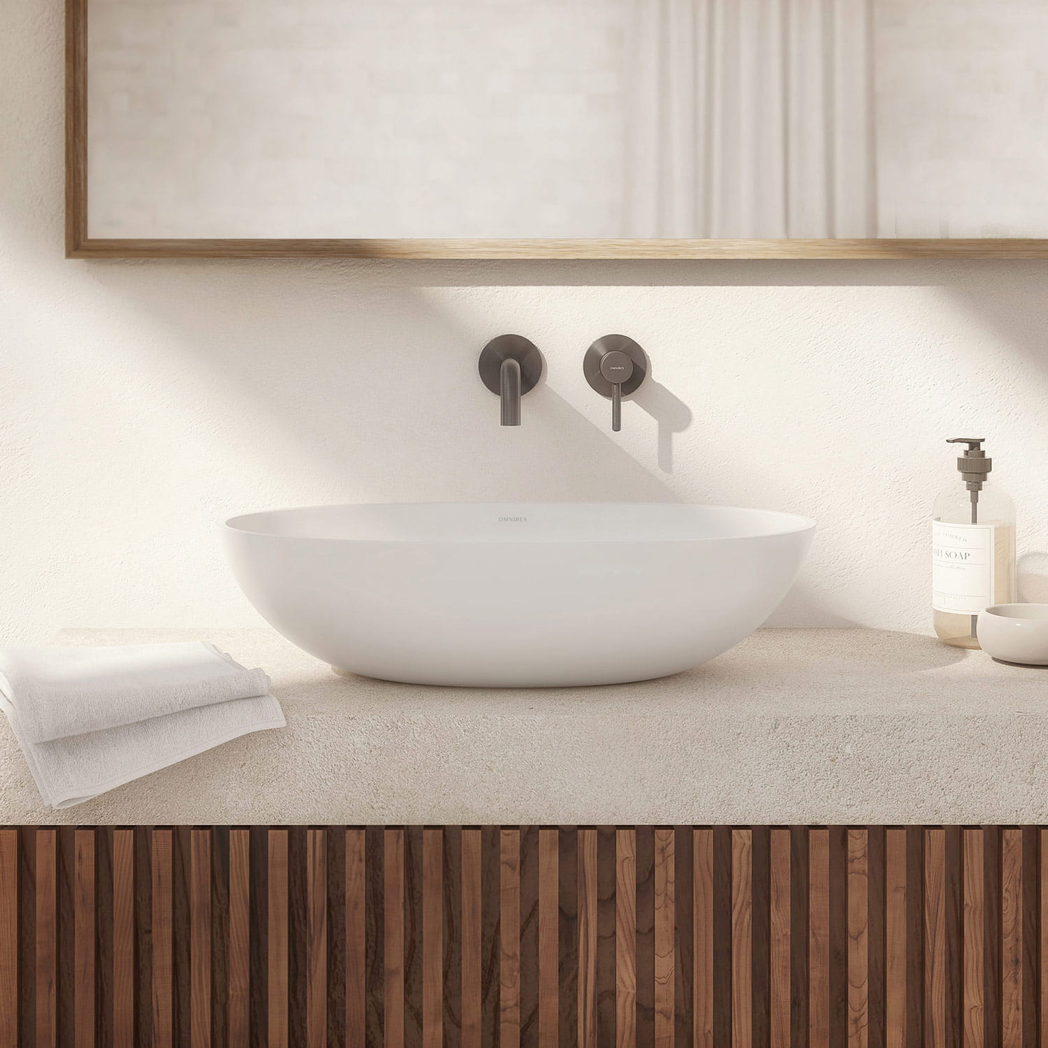 Umywalka nablatowa z kolekcji OMNIRES SHELL M+ charakteryzuje się współczesną eliptyczną formą, która miękką linią zwęża się ku podstawie. Minimalistyczna bryła wygląda lekko a zarazem solidnie, tworząc efekt wyrzeźbionego ze skały monolitu. Wewnątrz umywalki dopasowana maskownica dyskretnie zakrywa odpływ, nie zaburzając przy tym harmonijnie wyprofilowanej sylwetki.