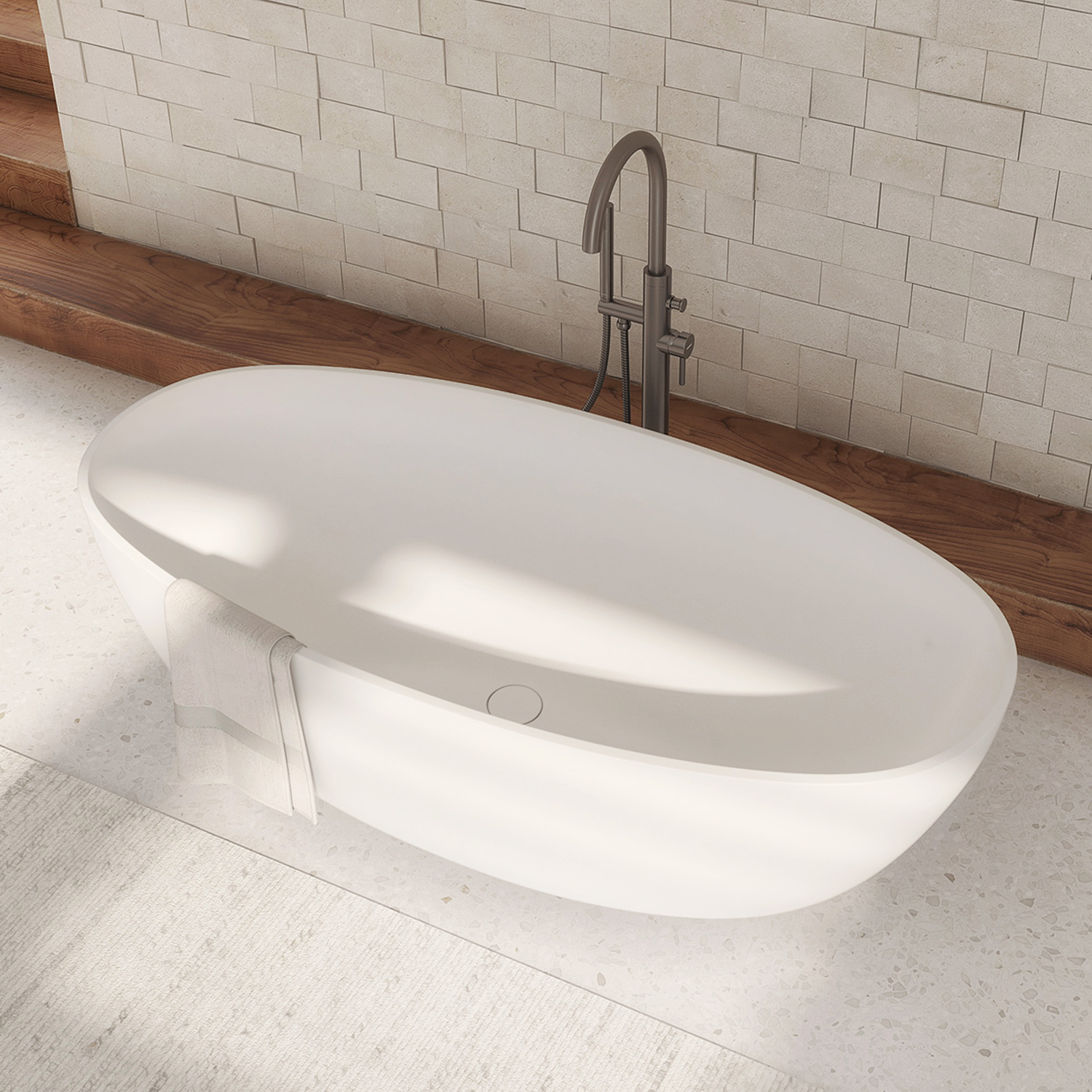 Wanna wolnostojąca z kolekcji OMNIRES SHELL M+ charakteryzuje się współczesną eliptyczną formą, która miękką linią zwęża się ku podstawie. Minimalistyczna bryła wygląda lekko a zarazem solidnie, tworząc efekt wyrzeźbionego ze skały monolitu. Wewnętrzny profil został wyprowadzony tak, by zapewnić komfort podczas kąpieli. Bryła wykończona jest solidnymi, precyzyjnie wykonanymi rantami o grubości 2 cm. Wanna charakteryzuje się niskim osadzeniem, co wzmacnia komfort użytkowania przy samodzielnym wchodzeniu i wychodzeniu czy kąpaniu dzieci. Posiada wygodne w użytkowaniu rozwiązania, takie jak syfon z dopasowanym korkiem klik-klak w komplecie, czy odpływ zlokalizowany centralnie, dzięki czemu w wannie mogą wygodnie wypoczywać dwie osoby.