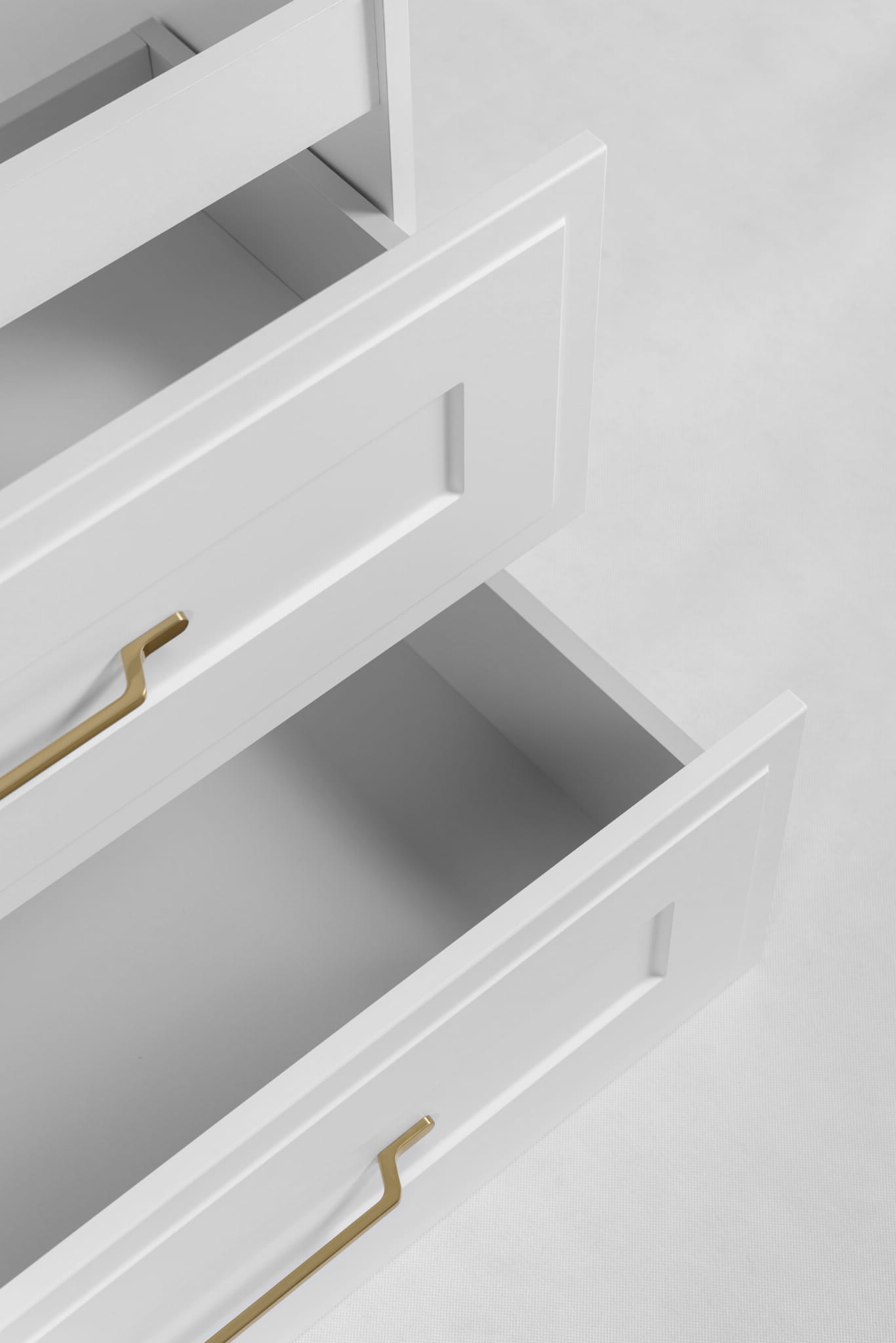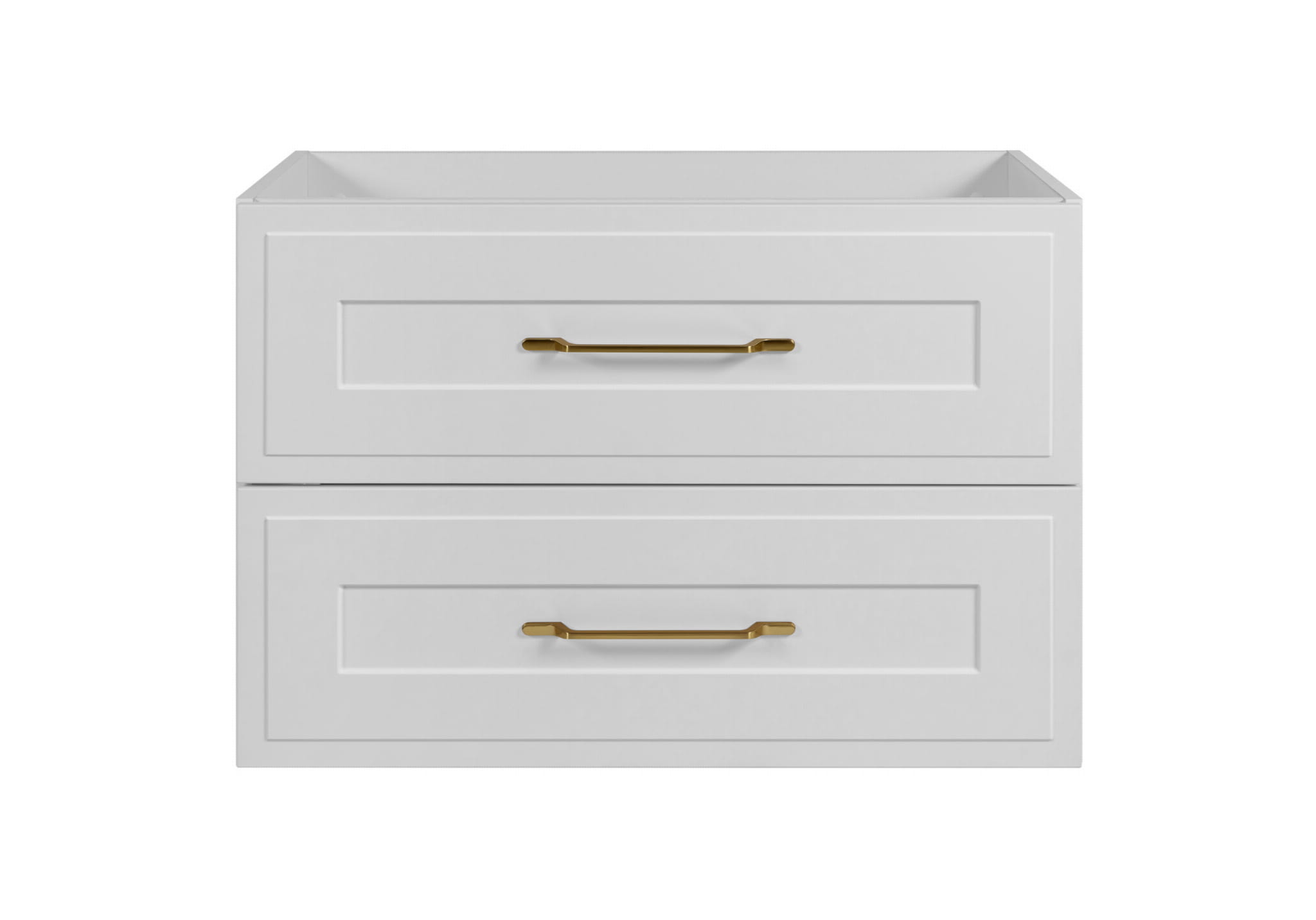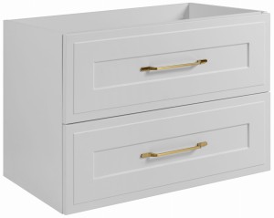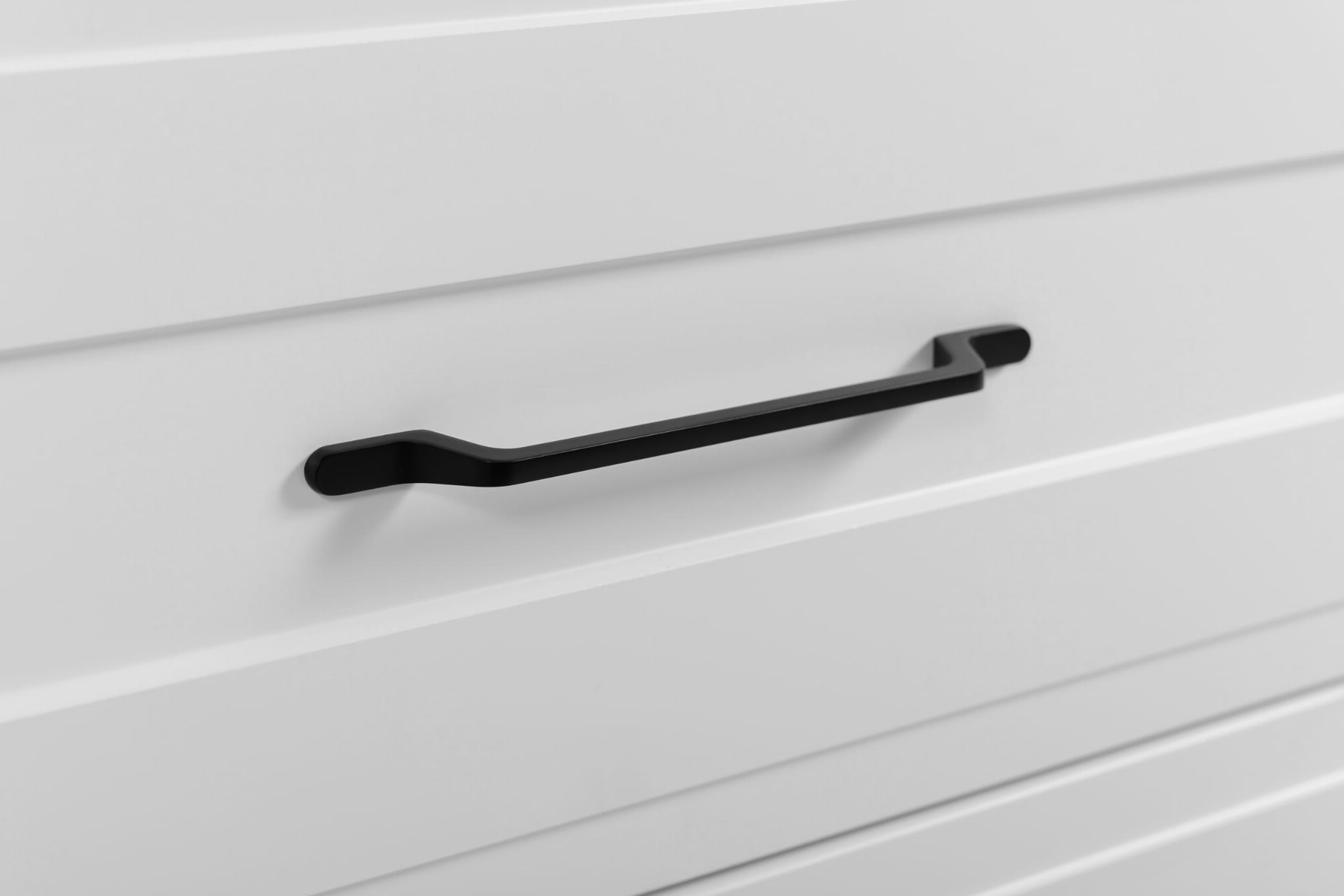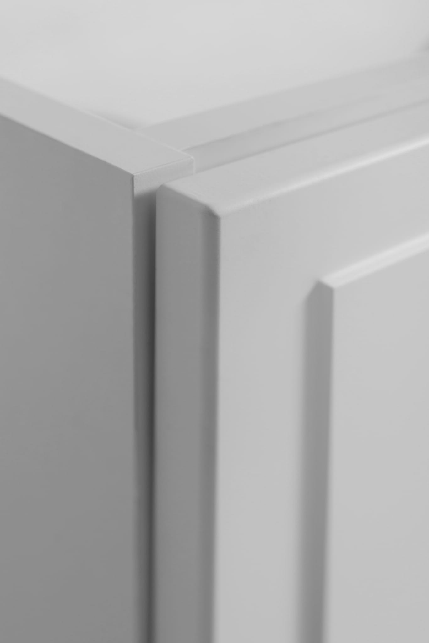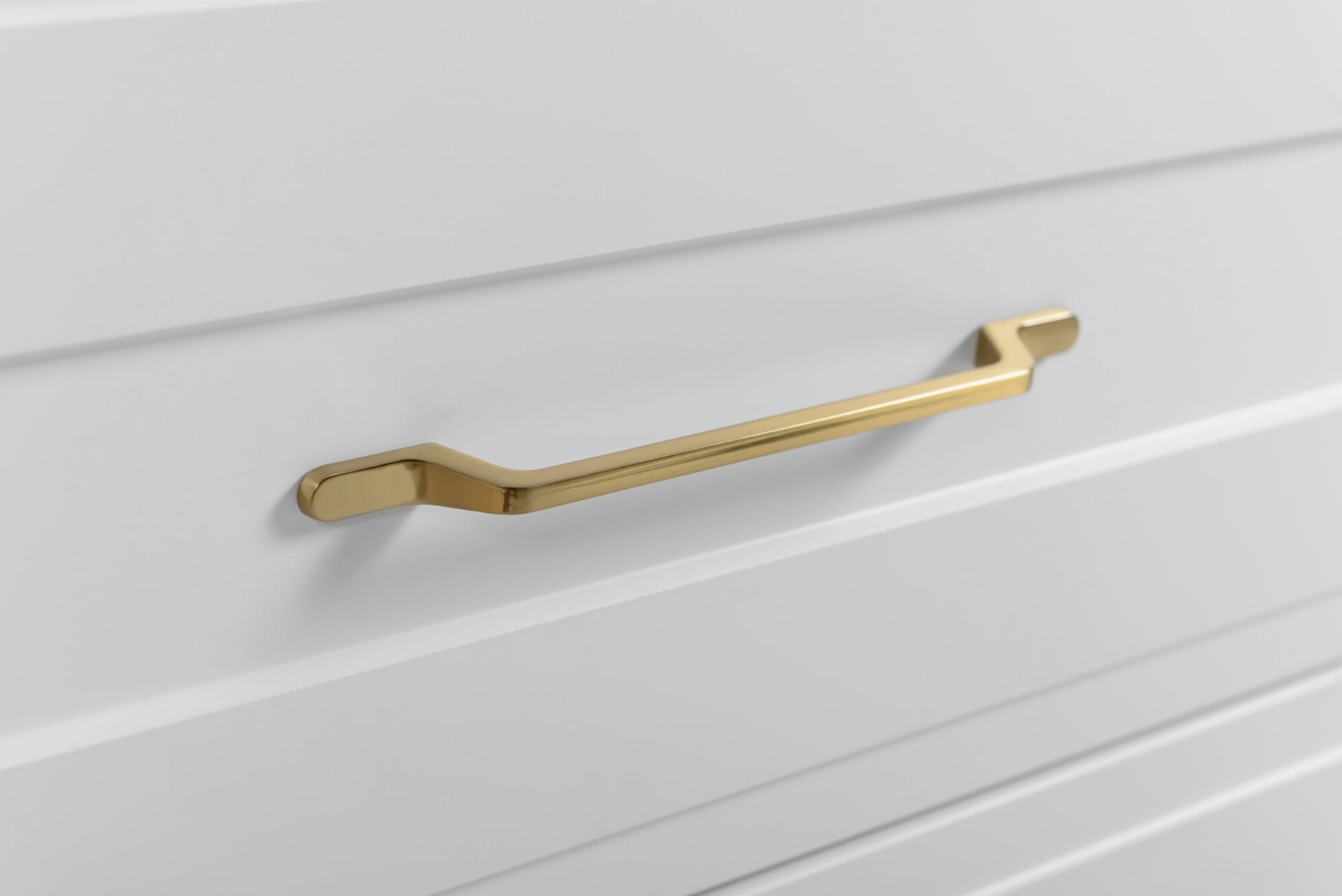 Subtelne kolory, takie jak kaszmir, czy elegancki czarny lub biały, doskonale wpisują się w różne aranżacje wnętrz, dodając im wyjątkowego charakteru. Stylowa, szeroka ramka na frontach podkreśla nowoczesny wygląd szafek, a metalowe uchwyty w złotym odcieniu nadają im luksusowego wykończenia.