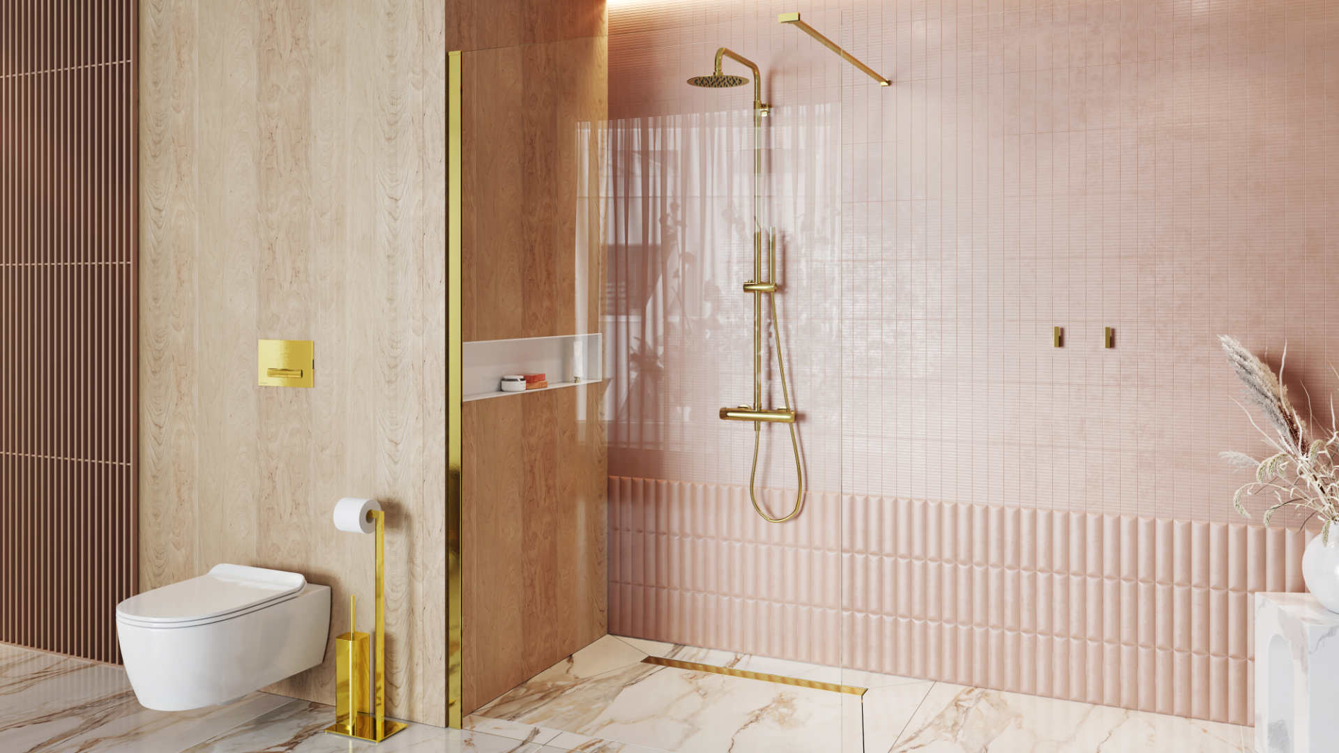 Wykonany z wysokiej jakości mosiądzu, zestaw wyróżnia się nie tylko trwałością i niezawodnością, ale również eleganckim, nowoczesnym designem. Kolor złoty połysk nadaje łazience wyrafinowanego charakteru, doskonale wpisując się w zarówno klasyczne, jak i minimalistyczne aranżacje.